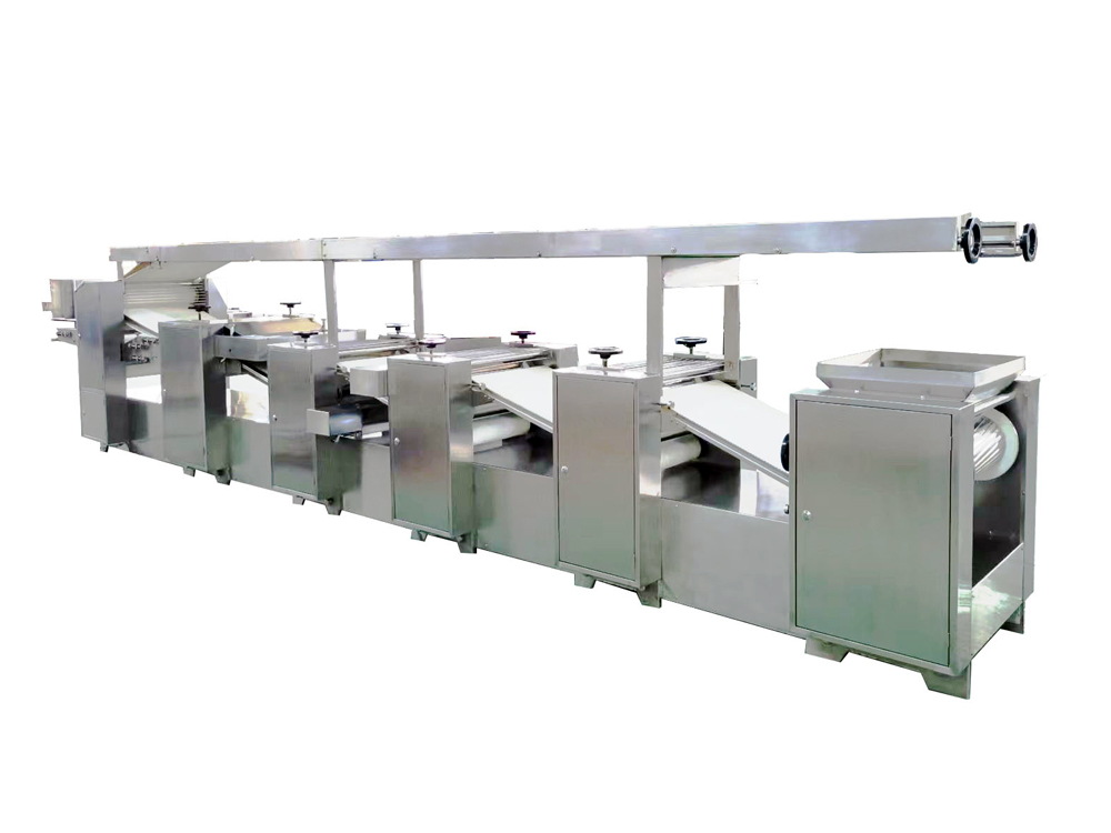 制皮機為臥式成型機,通過傳送機構將各道軋輥線速度比合理分配,實現從投料到制皮成型自動化生產。適用于餃子皮、餛飩皮、燒麥皮、蒸餃皮、以及燙面類面皮成型。